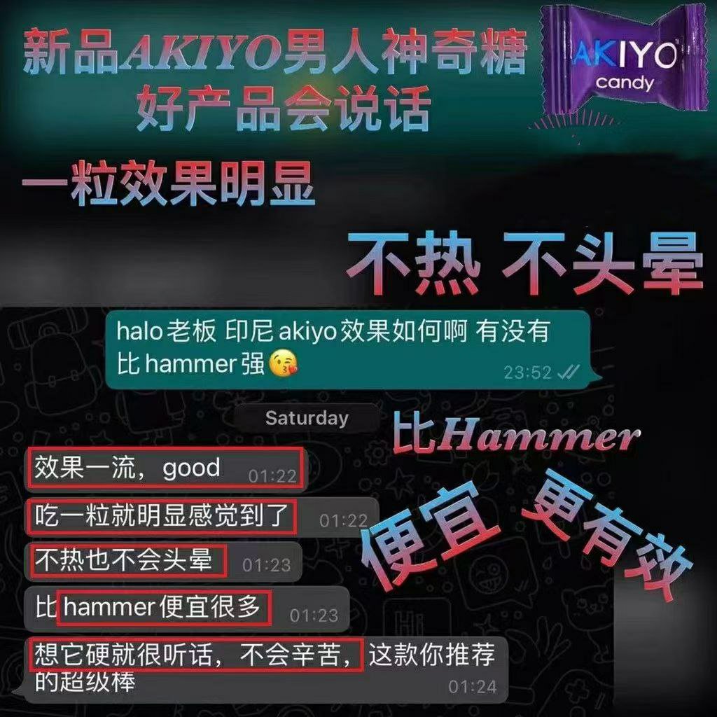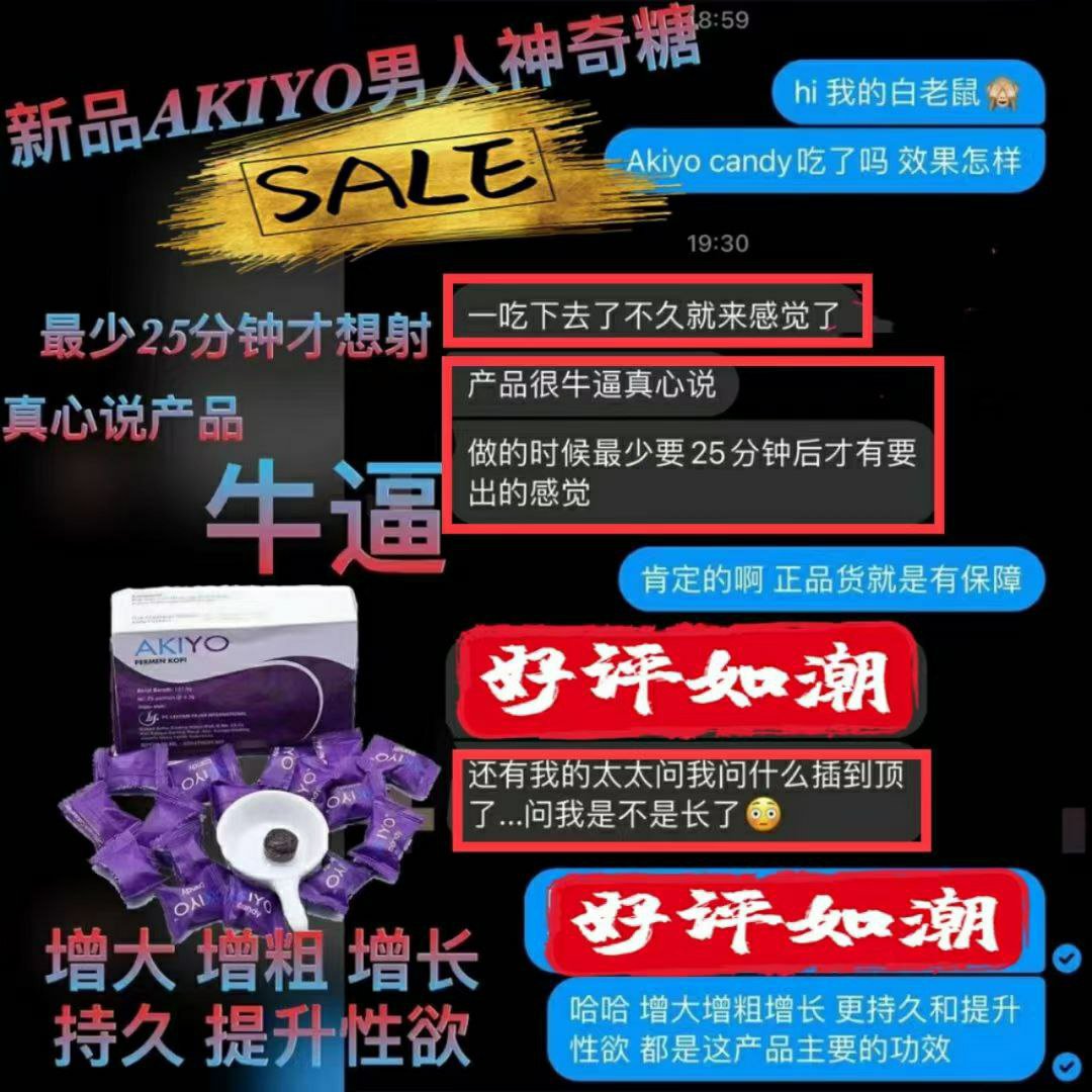 答:Akiyo汗馬糖能改善細胞疲勞,血液循環暢通,人也變得精力充沛,此外,能使肌肉更加敏捷,體力以及耐力得到提升,增加房事素質。