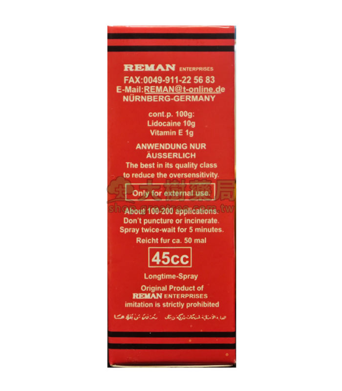 | 學名 | 延時噴霧 | 生產藥廠 | 德國漢堡醫藥有限公司 | ||