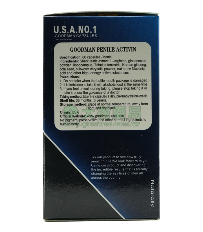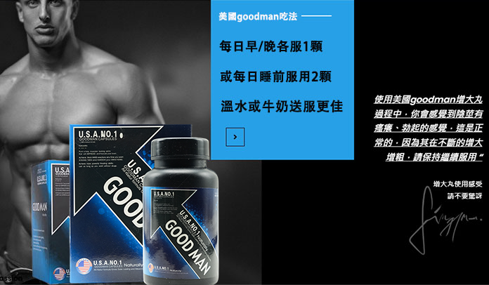 美國最大男性產品集團出品的GOODMAN陰莖增大丸,第三代原裝增大增粗藥,每一顆使用goodman膠囊的人都有驚歎的評價,他對於增大確實有快速且強的效果,美國goodman既是壯陽藥,也是名副其實男性保健品!美國GOODMAN增大膠囊是陰莖增大第一品牌,是目前最有效壯陽藥,最強大的男性性保健用品,美國GOODMAN陰莖增大活力素能迅速提高男性性能力,有效增長增粗,提高性生活質量,這款增大丸有99.98%的有效率,增大後不反彈、適用性高是goodman最大的優點,而且還是美國Naspacin maker 公司研製,在效果、副作用、評價都做到了最佳!是所有期望增大陰莖人群的必選產品!