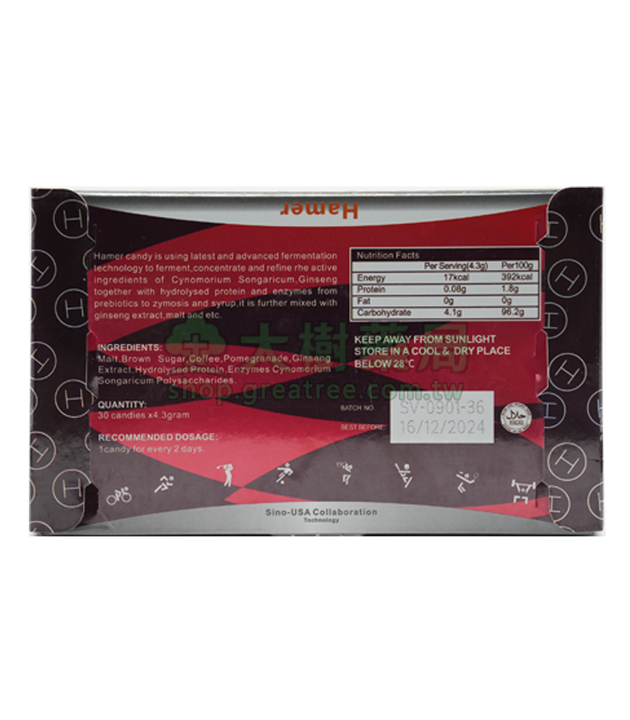 汗馬精力糖(Hamer Candy)是由獨特的配方製成,主要成分鎖陽含有細胞健康所需的營養。汗馬精力糖是純天然食品,能幫助補充細胞營養,本産品的安全度非常高,所有原料均為食品.