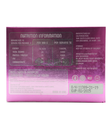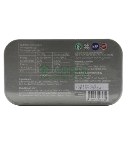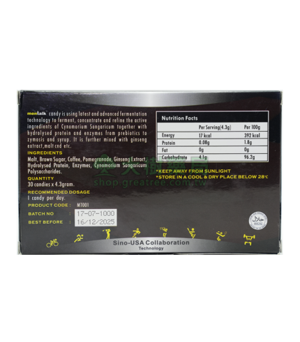 精力充沛:提高我們的機能,並保持一個健康和快樂的生活,從汗馬糖中獲取氨基酸的補充,尤其是在鍛煉之中,它會很快的使您的身體更加敏捷和強勁有力。