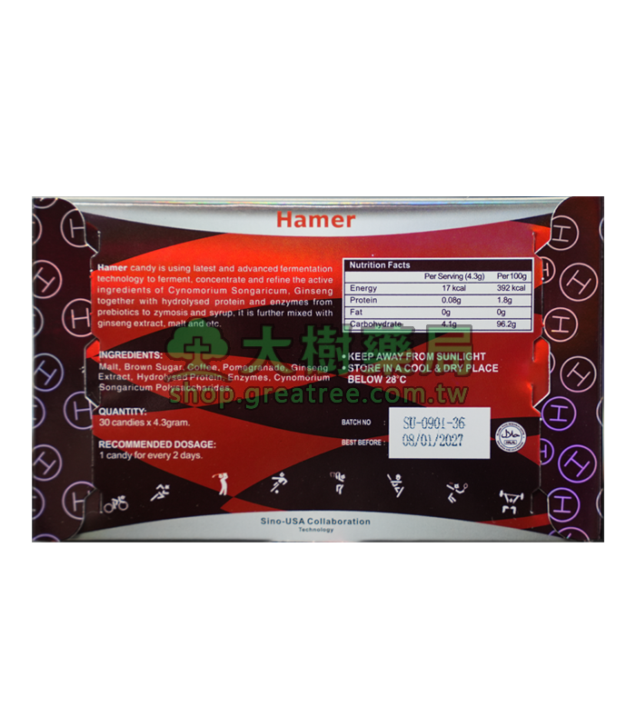 汗馬糖(Hamer candy)歷經15年研發而成,主要成分為鎖陽、人參,主要功效是補益陽氣,養筋健骨,補氣養血,緩解血虛型便秘,汗馬精力糖由於快速補充人體細胞營養,延緩老化進程非常有效,數年來已成為運動員首選的細胞營養產品。