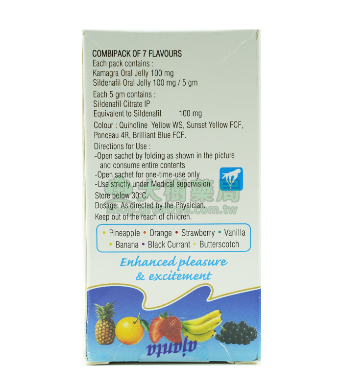 【用法用量】 Kamagra果凍每包含100mg 。反面對折,將果凍擠入口中,吞下小袋的全部內容物。 Kamagra果凍溶液非常快速地融化,並在服用後約15-30分鐘內被身體的酶吸收。 Kamagra果凍消耗後工作約6-8小時,因此被稱為即時勃起和有趣的解決方案。每日最多服用1次。